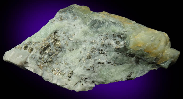 | Description: | Yellow-metallic pyrite in non-fluorescing translucent greenish calcite. The pyrite is visible on all sides of the specimen. From my personal collection #274. Collected ca. 1990 |