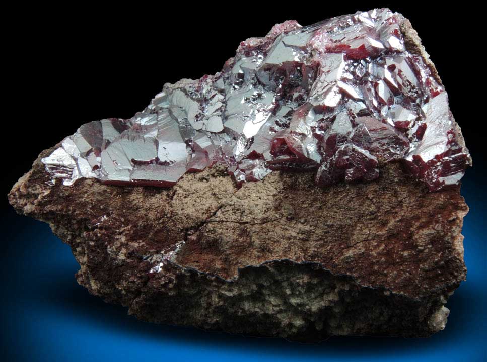 | Description: | Superb specimen of lustrous translucent dark-red cuprite crystals in flat formations of subparallel crystals lying flat on gray-brown matrix. This is the best cuprite specimen I obtained from this new find in the deeper portions of the mine. Collected in 2015 |