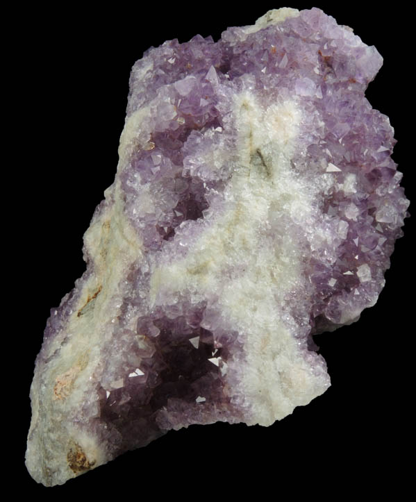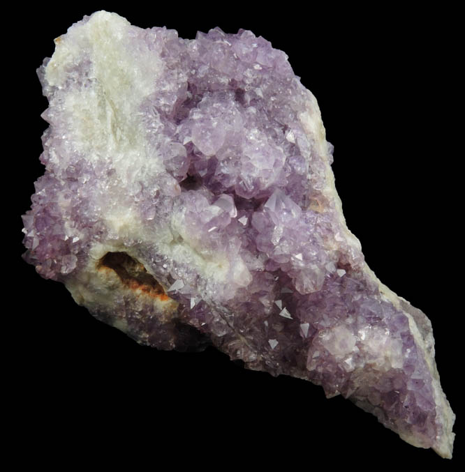 | Description: | Sparkling cluster of lustrous transparent purple amethyst quartz crystals lining the faces of narrow cavities exposed in massive quartz with microscopic hematite inclusions in one amethyst cavity. The amethyst crystals have deepest color on the tips. |