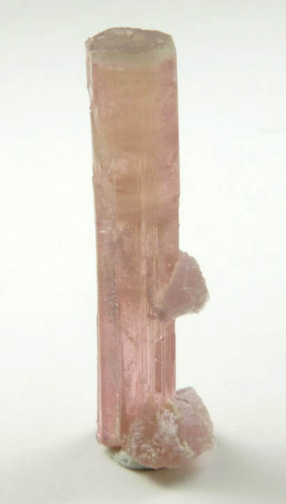 | Description: | Lustrous transparent rubellite tourmaline crystal, the pink variety of elbaite tourmaline, with rosettes to 4 mm of purple lepidolite crystals on the side. The elbaite crystal has a flat basal pinacoid termination with faint green tint. Collected ca. 1960. Weight: 0.97 grams |
