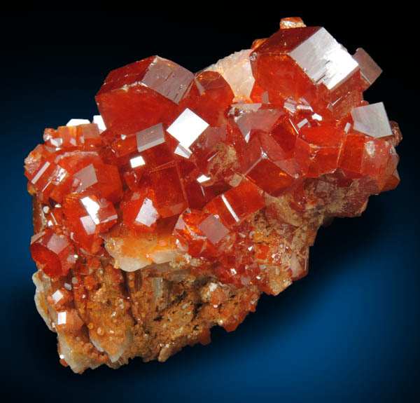 | Description: | Excellent cluster of large lustrous transparent-to-translucent vivid-red vanadinite crystals to 8 mm on bladed white barite crystals to 15 mm with partial brown coating. The vanadinite crystals are tabular hexagonal form with hard-to-find deep-red color. Collected in 2004 |