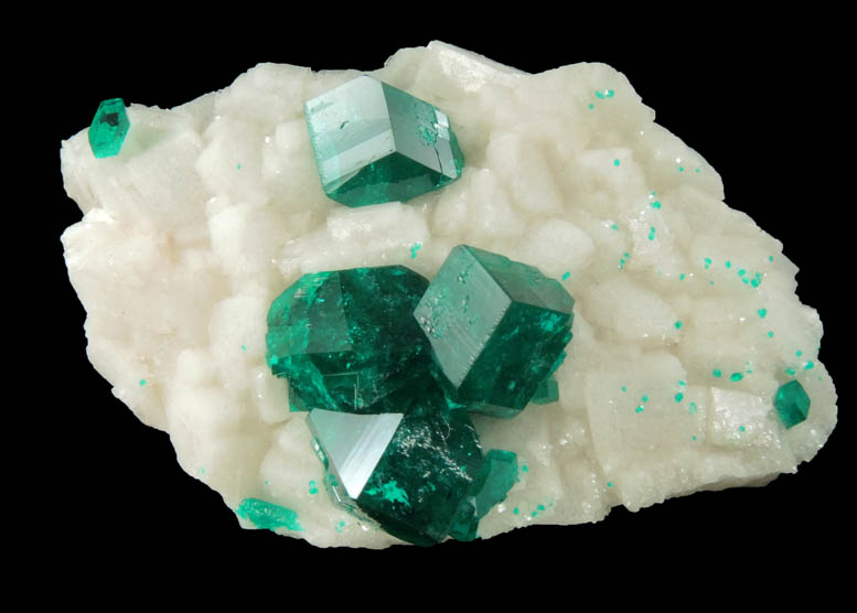 | Description: | Superb miniature specimen of lustrous transparent emerald-green dioptase crystals to 10 mm on contrasting translucent white rhombohedral calcite crystals to 6 mm. Many small dioptase crystals are visible under magnification. |