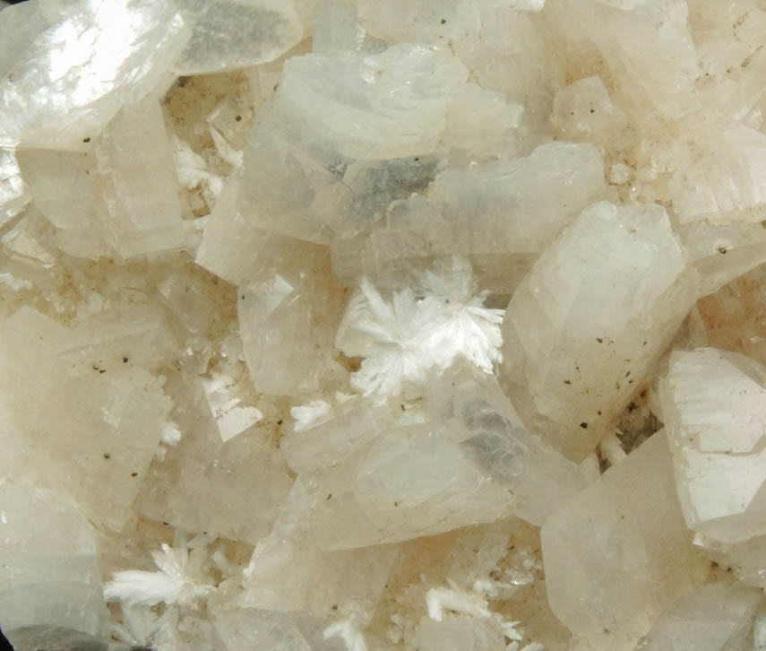 | Description: | Lustrous translucent pinkish heulandite crystals to 7 mm with sprays of prismatic white laumontite crystals to 4 mm plus colorless transparent quartz crystals to 2 mm. A few heulandite crystals have dark green-gray babingtonite crystal inclusions. Collected ca. 2000 |