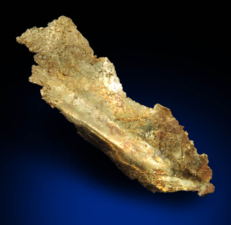 | Description: | Twisted leaf-shaped formation of native gold (naturally occurring gold) with no matrix attached. The surfaces of the gold have fine crystallization patterns visible throughout that look beautiful when viewed under magnification. Weight: 0.804 grams |