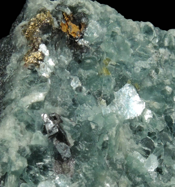 | Description: | Transparent-to-translucent grayish-green amesite crystals to 4 mm in a layer coating one face of matrix with minor yellow-metallic chalcopyrite, dark red-brown rutile and microscopic transparent yellow diaspore crystals. Ex. Joe Cilen (1916-1997) #7538; ex. Paterson Museum Collection (N.J.) |