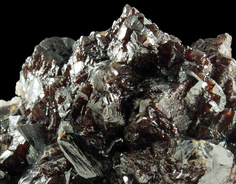 | Description: | Showy cluster of highly lustrous transparent dark-brown sphalerite crystals with small areas of rhombic dolomite crystals to 2 mm and gray quartz crystals to 1mm. The sphalerite crystals are repeatedly twinned resulting in complex form. Ex. D. Miller collection #M563; collected ca. 2005 |