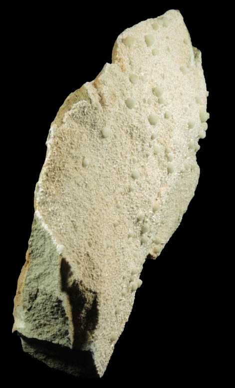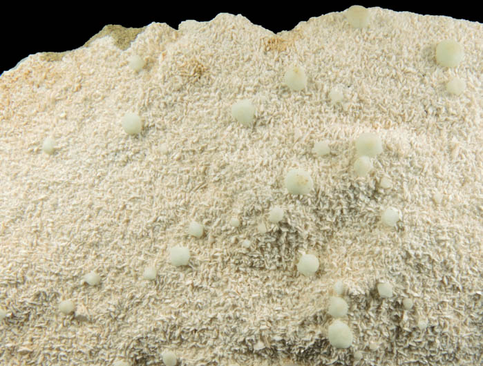 | Description: | Translucent pale-green prehnite crystals in hemispherical aggregates to 3 mm diameter on beige-white bladed albite crystals to 1.5 mm completely covering one face of brown matrix. The prehnite and albite crystals flaked off on one small area. Collected by Bob Kreider ca. 1980 |