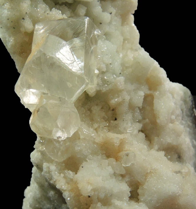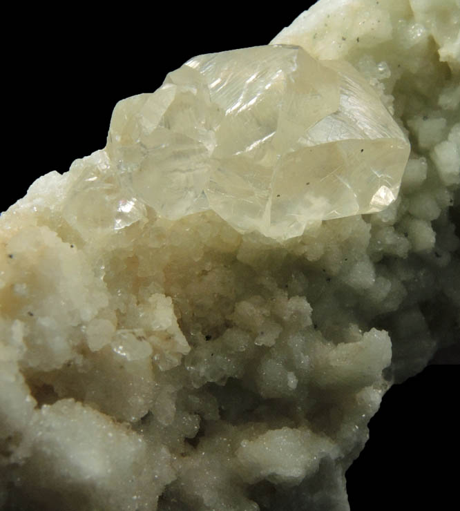 | Description: | Lustrous transparent pale-yellow (nearly colorless) interpenetrant-twinned rhombohedral calcite crystals to 7 mm on lustrous translucent pale-green datolite pseudomorphs after unknown mineral, possibly quartz or calcite. Collected in 2000. |