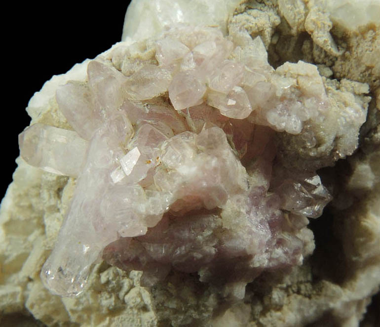 | Description: | Translucent pink rose quartz crystals to 5 mm on platy cleavelandite variety of albite feldspar crystals to 6 mm. Rose quartz does not ordinarily form crystals and are known from only a few localities worldwide. Collected in June 1969 by Cliff Trebilcock |