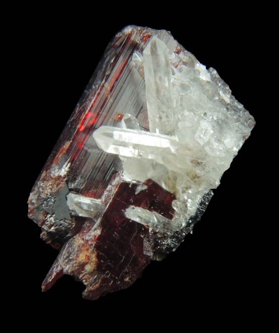 | Description: | Lustrous 11 mm translucent dark-red hübnerite crystal (hubnerite crystal) with lustrous transparent colorless quartz crystals to 4 mm. The hübnerite crystal is a striated bladed form with angled termination edges. Collected ca. 1980 |