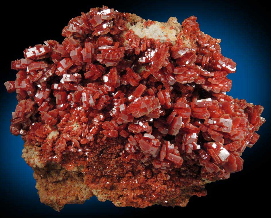 | Description: | Large cluster of lustrous translucent red vanadinite crystals almost completely covering front and top edge of tan-colored barite-rich matrix. The vanadinite crystals are tabular hexagonal form with brown subsurface inclusions on the rear faces. Collected in 2011 |