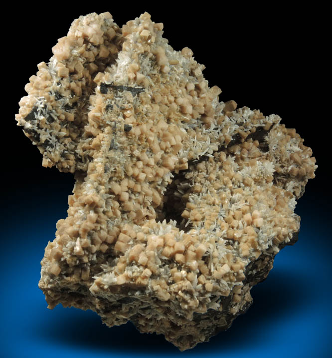 | Description: | Double-sided cluster of lustrous white acicular bultfonteinite crystals to 4 mm long bundled aggregates of subparallel crystals with lustrous translucent beige-colored olmiite crystals to 3 mm over both sides of manganese-rich black matrix. The olmiite fluoresces red and the bultfonteinite fluoresces white under 365 nm LW UV illumination |