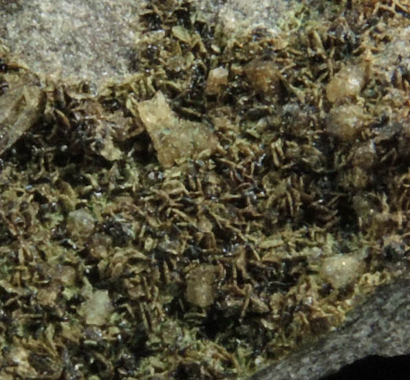 | Description: | Lustrous transparent pale-brown prismatic-to-equant sodalite crystals to 1.3 mm on bladed translucent crystals of an unidentified mineral, possibly phlogopite, that was overgrown with greenish-brown microcrystals of another unidentified mineral. From the 1631 eruption of Mount Vesuvius. Ex. Giorgio Bottoni (Milano) |