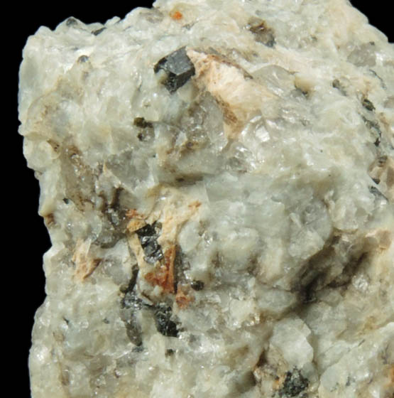 | Description: | Microscopic blades of translucent brown janhaugite with small blocky pale-pink (nearly colorless) dalyite and black aegirine in coarse-grained quartz-feldspar matrix. The dalyite fluoresces yellow-white under SW UV illumination. Ex. David M. Shannon (1942-2004); from a specimen collected by Jan Haug |