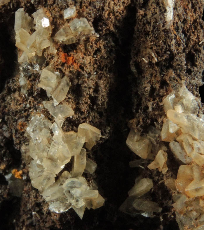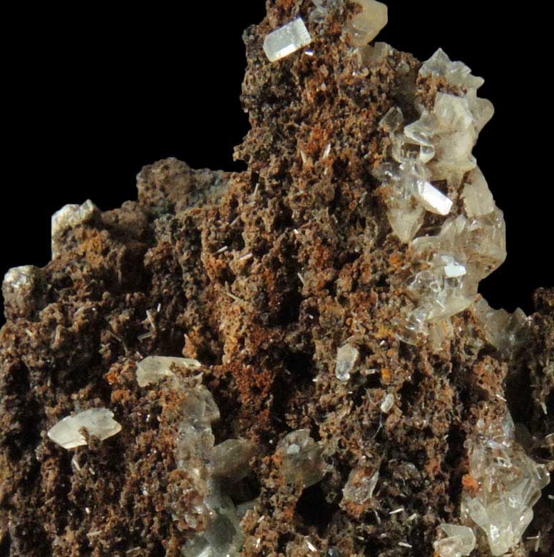 | Description: | Lustrous transparent pale yellow-gray tarbuttite crystals lining shallow cavities in earthy brown gossan. The tarbuttite crystals are flattened prismatic form with slightly striated crystal faces. Ex. Julius Weber (1914-2003) collection, principle photographer of the Encyclopedia of Minerals (1974) |