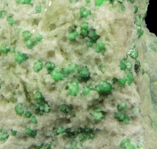 | Description: | Lustrous vivid-green uvarovite garnet crystals to 0.6 mm with pale green diopside crystals to 1.2 mm. Some uvarovite garnets are incomplete revealing dark black-metallic cores of chromite. See Mineralogical Magazine, March 1984, Vol. 48, pp. 31-37. Ex. Roger Wai-Son Doo collection ca. 1979 (see Mineralogical Record v.10 #1, p. 41-42) |