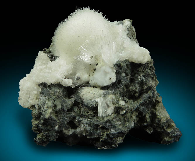 | Description: | Hemispherical sprays of radiating lustrous acicular white natrolite crystals to 5 mm over lustrous transparent colorless apophyllite microcrystals on greenish basalt. This quarry is now closed and reclaimed. Collected in October 2001 during MMMS field trip. |