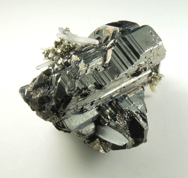 | Description: | Showy lustrous gray-metallic doubly-terminated bournonite crystals to 32 mm with slender translucent white quartz crystals to 8 mm and small yellow-metallic pyrite crystals to 1 mm. The bournonite crystals have complex crystallization patterns throughout For locality information see: Mineralogical Record v.42#6, Rocks and Minerals v.80#1 |