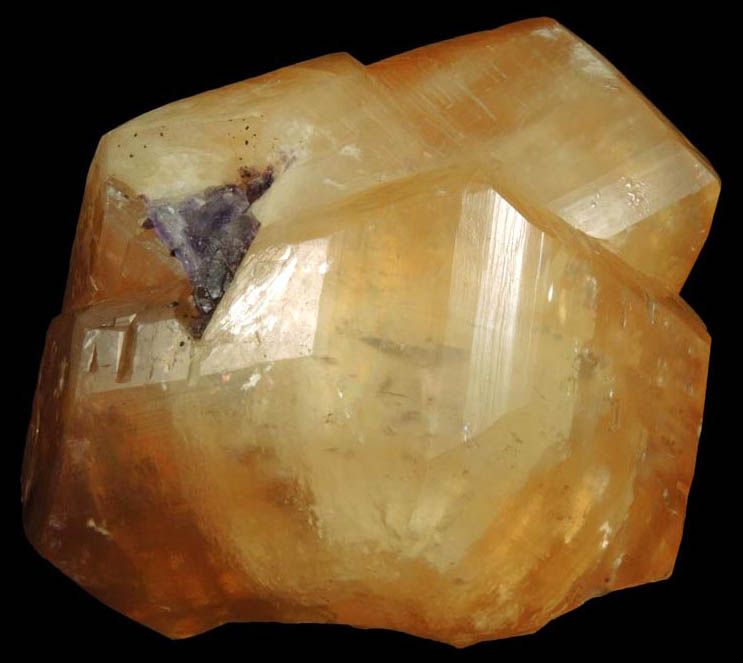 | Description: | Large translucent golden-brown calcite crystals with remnants of purple fluorite on the top where a crystal intersected the calcite cluster. The calcite crystals have satin luster on the faces and are rhombic form with rounded secondary edge faces. Ex. Roy A. Smith (1935-2014) collection; collected ca. 1985 |