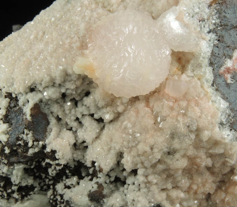 | Description: | Translucent pale-pink manganese-rich calcite crystals in spherical aggregates to 12 mm diameter and bladed translucent white barite crystals to 17 mm on lustrous translucent white quartz crystals to 1.5 mm over reddish-black hematite. Collected ca. 1985 |