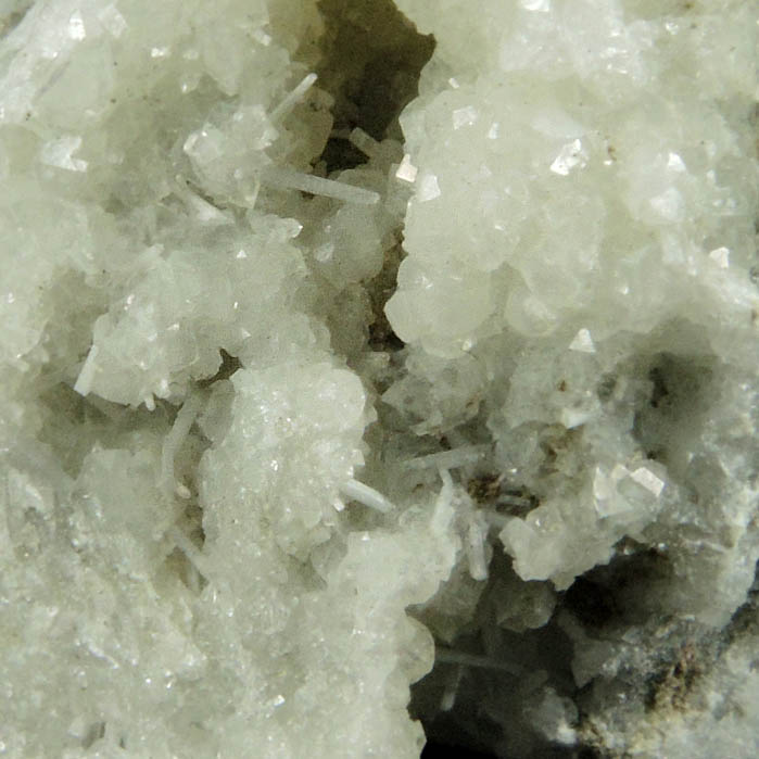 | Description: | Scattered elongated translucent white natrolite crystals to 2 mm on lustrous transparent colorless rhombic calcite crystals to 1.5 mm with translucent pale-green datolite crystals to 1 mm. Many natrolite crystals are visible when viewed under 20x. Collected in October 2001 during MMMS field trip. This quarry is now closed and converted to residential housing |