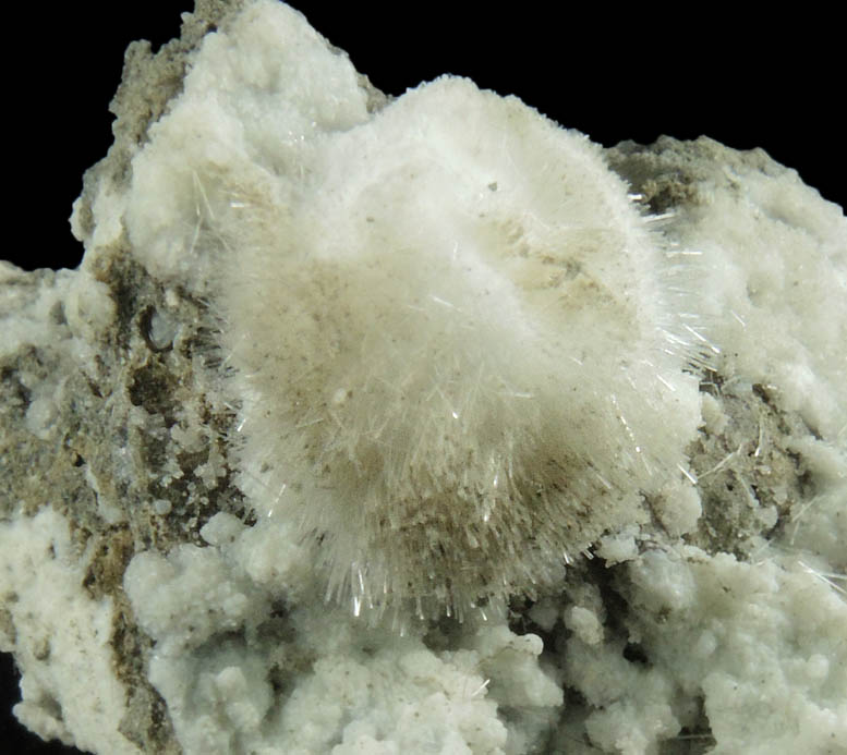 | Description: | Spherical group 10 mm across of radiating lustrous transparent-to-translucent brownish hair-like natrolite crystals on translucent white calcite crystals in rosettes to 1 mm on gray basalt. Collected in October 2001 during MMMS field trip. This quarry is now closed and converted to residential housing |