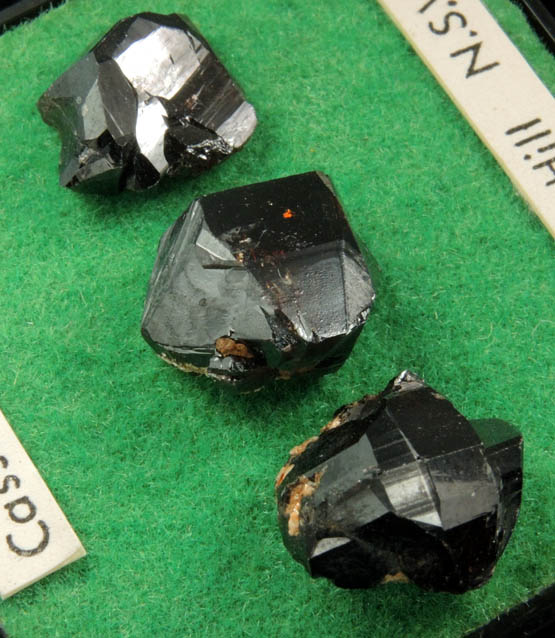 | Mineral: | Cassiterite (3 mounted crystals) |
