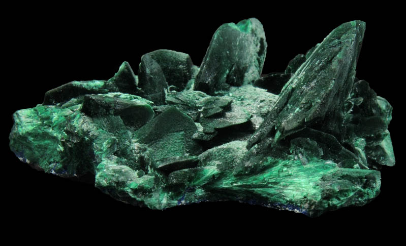 | Description: | Fibrous green malachite pseudomorphs after bladed azurite crystals to 15 mm. The azurite crystallized first, then altered molecule by molecule to fibrous malachite maintaining the original shape of the azurite crystals. Pseudomorph meaning: false form. Collected in 2012-2013 |
