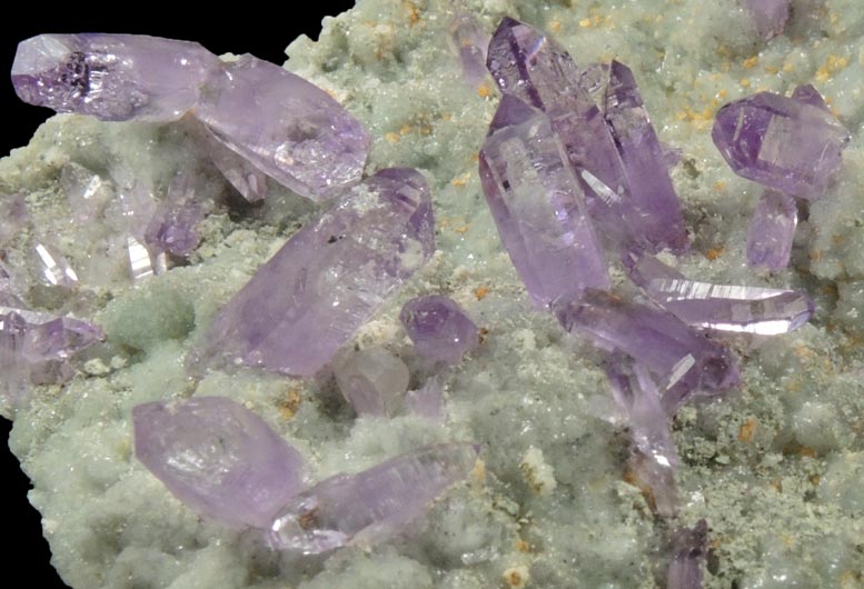 | Description: | Lustrous transparent purple amethyst quartz crystals to 13 mm on smaller lustrous transparent pale-green quartz crystals to 0.5 mm over calcite and dolomite. Many of the amethyst quartz crystals are doubly-terminated. Excellent color for the locality. ex. Fabrizio Ferrero (Torino) |