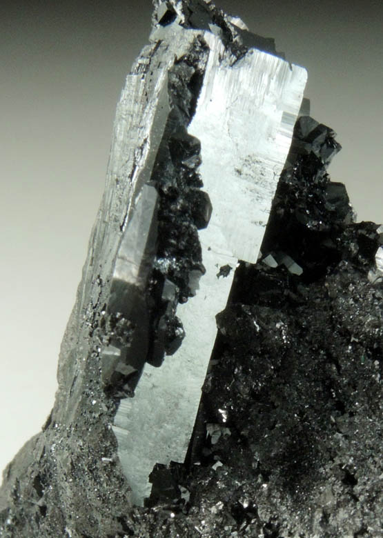 | Description: | Superb unusual elongated rectangular bixbyite crystal measuring 21 mm top to bottom, nestled in a crevice is fine-grained crystalline bixbyite with wedge-shaped black hausmannite crystals to 10 mm. The bixbyite crystals are lustrous black. From my personal collection; collected in 2014 |