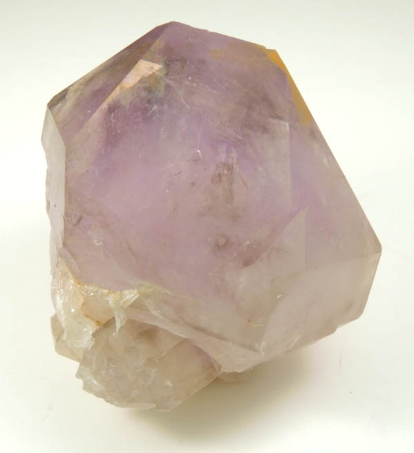 | Description: | Lustrous transparent purple parallel amethyst crystal with an earlier generation of milky quartz crystals with minor brown limonite. The amethyst crystal has internal phantom-growth zones of deeper color deep inside the crystal termination. |