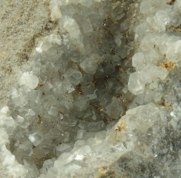 | Description: | Two cavities in gray matrix lined with transparent colorless calcite crystals. The calcite crystals are equant hexagonal form with rhombohedral terminations (nail head habit). |