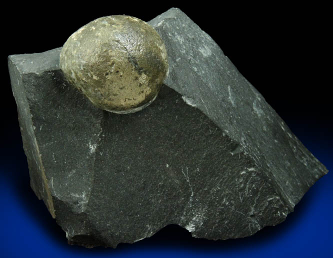 | Description: | Spherical nodule 18 mm diameter of yellow-metallic crystallized pyrite in dark gray shale. The nodule has fine crystal faces in parallel orientation indicating it is polycrystalline. |