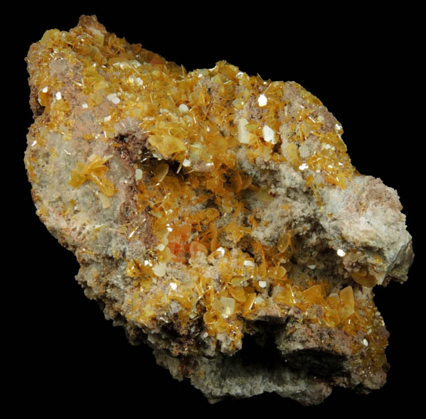 | Description: | Lustrous transparent-to-translucent yellow wulfenite crystals on 3 sides of gray matrix. The wulfenite crystals are thin square blades with secondary faces in the corners that give the wulfenite crystals a rounded appearance. Collected ca. 1975 |