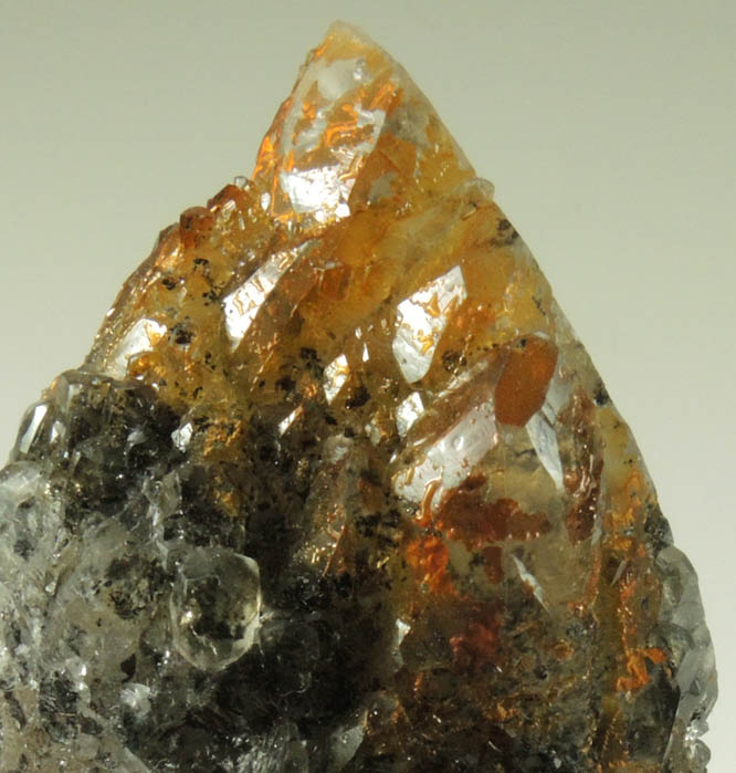 | Description: | Lustrous transparent yellow-to-gray scalenohedral calcite crystals to 45 mm with overgrowth of rhombic gray zoned dolomite crystals in twisted saddle-shaped aggregates to 8 mm on a matrix that is coated with lustrous black micros (goethite?) Collected ca. 2011-2012 |