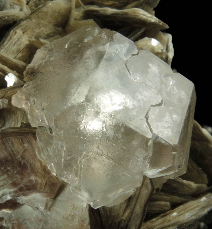 | Description: | Transparent colorless cubo-octahedral fluorite crystals to 28 mm on platy muscovite mica crystals to 15 mm. The fluorite crystals are interpenetrant-twinned with distinct suture line visible on the top surface. Ex. Dr. N. Luppescu, originally acquired in 2009 from D. Blauwet |