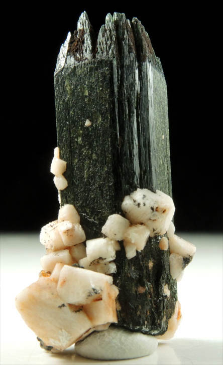 | Description: | Striated black aegirine crystal 31 mm long with complex termination that indicates the aegirine is actually a bundle of parallel crystals. Blocky white microcline feldspar crystals are included around the bottom end of the aegirine crystals. |