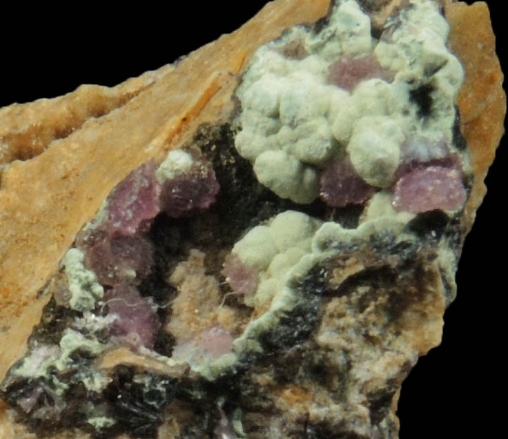 | Description: | Pale-green kidwellite crystals in radiating hemispherical aggregates to 1 mm with transparent pink-purple strengite crystals in aggregates to 1.2 mm. |