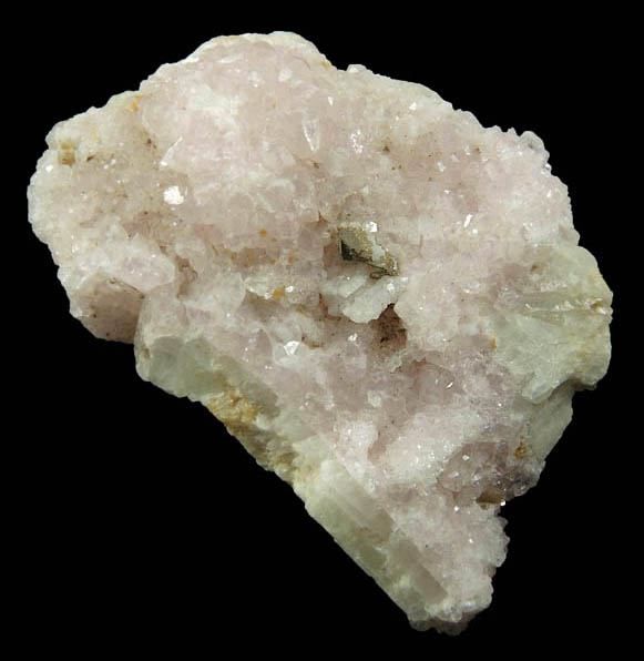 | Description: | Small sparkling cluster of lustrous transparent pink rose quartz crystals almost completely covering the front face of platy colorless albite crystals. Rose quartz crystals are rare. Ex. Franklin Mineral Museum (N.J.); ex. Steve Murphy collection |