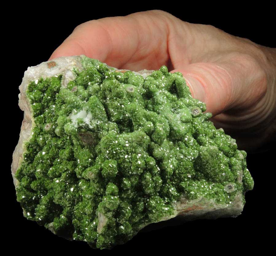 | Description: | Rich cluster of lustrous translucent green austinite crystals to 1.5 mm completely coating elongated quartz crystals to 16 mm. Austinite, a rare arsenate mineral, is difficult to obtain from Tsumeb (only three illustrated on Mindat.org). Ex. Vochten collection; Weinrich 2661085; species confirmed by Marcus Origlieri |