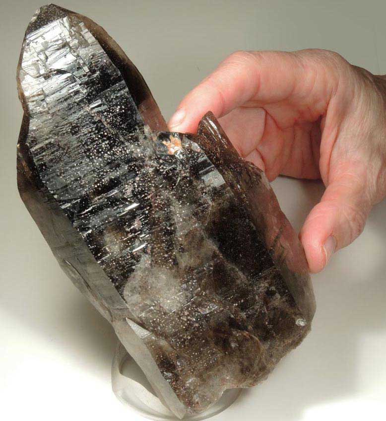 | Description: | Very large lustrous transparent-to-translucent smoky quartz crystals with complex suture patterns on the prism faces, indicating twinning following the Dauphiné Law of quartz twinning. A smaller incomplete smoky quartz crystal intersected one edge. |