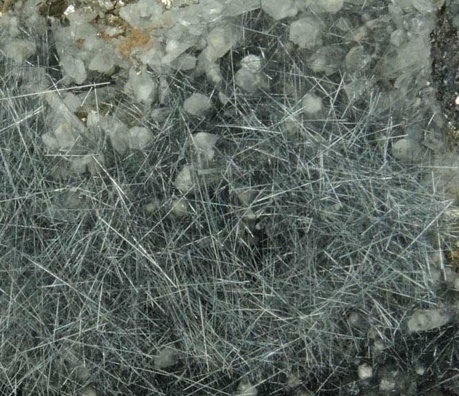 | Description: | Lustrous gray-metallic hair-like jamesonite-boulangerite crystals to 12 mm and lustrous yellow-metallic pyrite crystals to 5 mm on milky quartz. Both boulangerite and jamesonite occur at this locality — testing is required to determine exact species. Collected ca. 1985 |