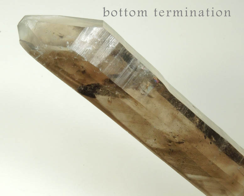 | Description: | Doubly-terminated slightly tapered lustrous transparent smoky quartz crystal with no matrix attached. The smoky coloration is internally zoned with phantom-growth patterns visible throughout. The prism faces are slightly striated. Collected by Paul Young ca. 1999 |
