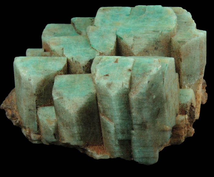 | Description: | Lustrous translucent blue-green amazonite crystals, the variety of microcline feldspar colored by lead impurities. The amazonite crystals are in parallel orientation and select prism faces have brown iron-oxide surface coating. |