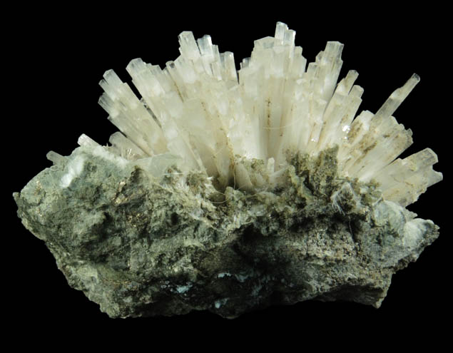 | Description: | Spray of diverging prismatic natrolite crystals on greenish basalt. The natrolite crystals vary from translucent to transparent at the terminations. The natrolite crystals have square cross-sections and have four-sided pyramidal terminations. Collected September 1996. |