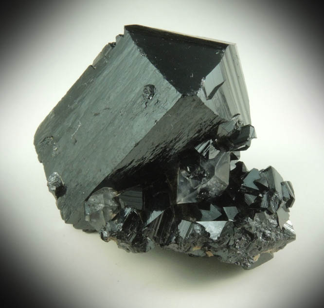 | Description: | Lustrous prismatic black ilvaite crystals to 22 mm with a 7 mm lustrous transparent colorless quartz crystals. The ilvaite crystals are short striated prisms, with rhombic cross-section, and terminated with two {011} faces. Collected ca. 1993 |