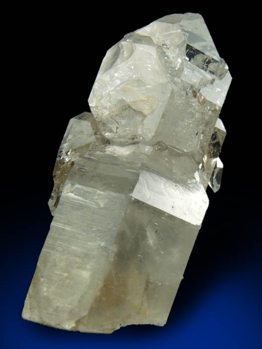 | Description: | Two generations of lustrous transparent colorless quartz crystals with no matrix attached. The largest 30 mm quartz crystal grew first, then was overgrown with smaller parallel quartz crystals to 20 mm forming a reverse-scepter formation. Collected ca. 1992 |