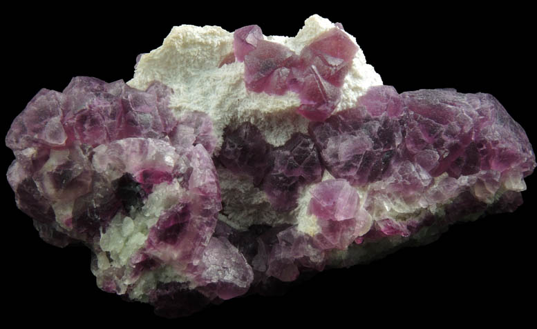 | Description: | Double-sided cluster of transparent deep-purple octahedral fluorite crystals etched from milky quartz matrix. The fluorite crystals have convex faces composed of microscopic subparallel faces that give the fluorite a waxy luster. Collected ca. 1991. The fluorite fluoresces dull violet under longwave UV illumination |