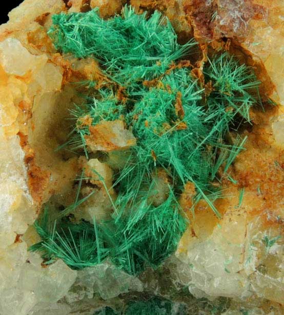 | Description: | Lustrous translucent green acicular brochantite crystals in shallow cavities in quartz. Collected ca. 1995 |