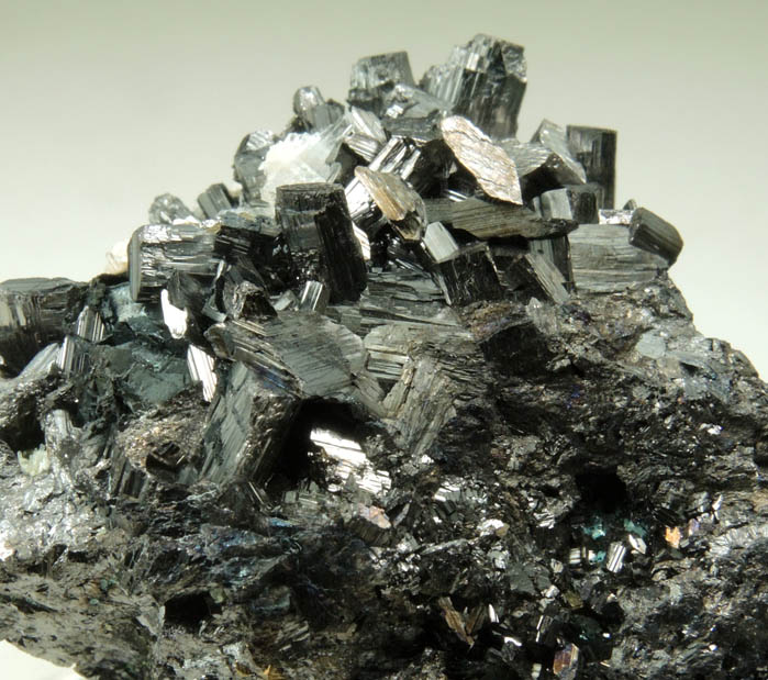 | Description: | Lustrous black-metallic enargite crystals to 5 mm with lustrous transparent colorless quartz crystals to 2 mm and a 2 mm yellow-metallic pyrite crystal, on a crystallized mass of enargite. The enargite crystals are dominated by striated {120} faces. Ex. John Pitfick (?-1969) private collection #699; collected ca. 1960 |